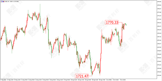 黄金方面:昨日(10月4日)黄金亚欧盘先回落,美盘快速拉升,突破1765美元的高点至1770美元。