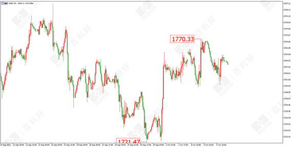 黄金方面:昨日(10月5日)黄金自1770美元回落,最低触及1748美元的位置,表现为震荡。