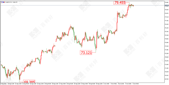技术面:原油周线多头趋势,震荡上行。日线8月底触及61.80美元之后持续上涨,周一(10月4日)在突破7月初76.95美元的高点之后强势上扬,目前已经接近80美元关口。日内来看,上方关注79.70美元的阻力,下方关注77.50美元的支撑。