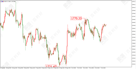 黄金方面:昨日(10月6日)亚欧盘照旧先向下回落,最低触及1745美元的位置,晚间快速拉升,截至目前最高触及1764.88美元的位置。