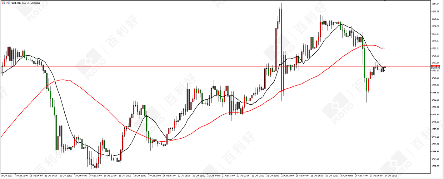 技术面:昨日(10月26日)金价短线下跌0.82%,收盘下影阴线,结束过去6个交易日的上涨势头。昨日下跌,但不妨碍日图均线系统实现金叉,周一(10月25日)提示重点关注1796美元位置继续有效。