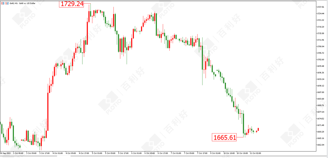 黄金方面:昨日(10月10日)黄金开盘即开始下跌,日内持续阴跌,最低触及1665美元的位置。