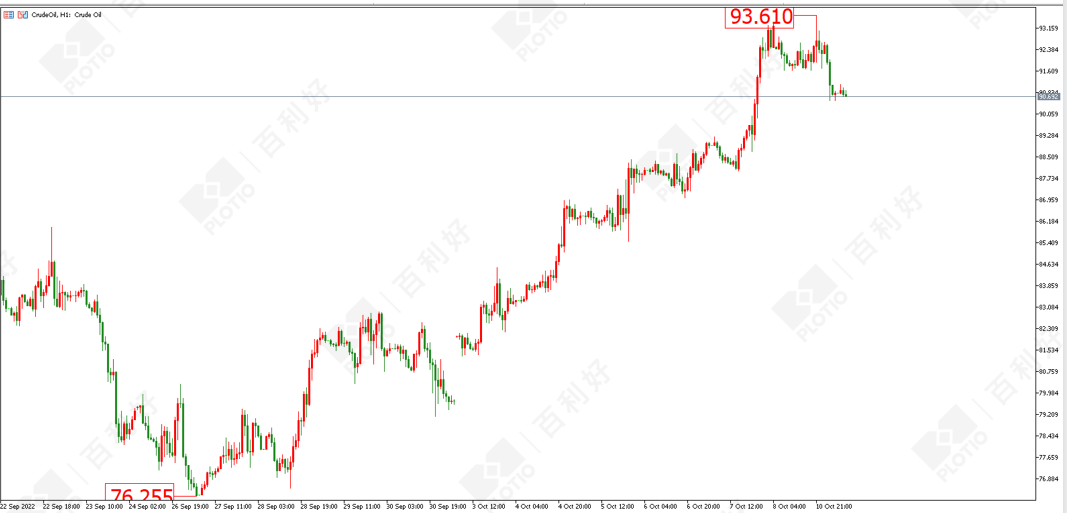 技术面:原油近两周从76美元一线的上涨,涨幅已经达到20%。昨日触及93.61美元的高点之后出现回落,从小时图来看,已经出现上涨加速的走势,若88美元一线失守,则可能标志着转为空头。