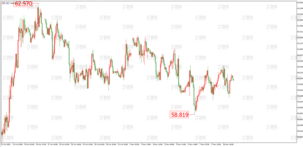 技术面:原油近两周震荡偏下,走势偏弱。小时图来看,若下破58.80美元则延续震荡下行;若上破60.40美元则有望冲击62.57美元的前高点,甚至形成新一轮上涨走势。