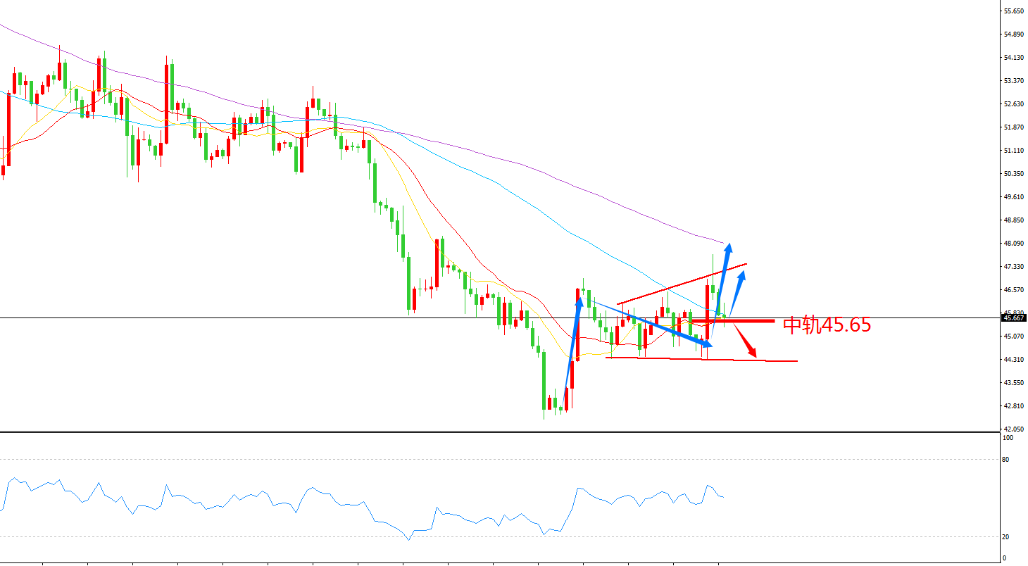 【原油】关注45.65点位,价格下破跟随空单,目标44.4美元,止损46.15;4小时K线在中轨之上收阳并站上45.9,进场多单,目标47美元,止损45.35.