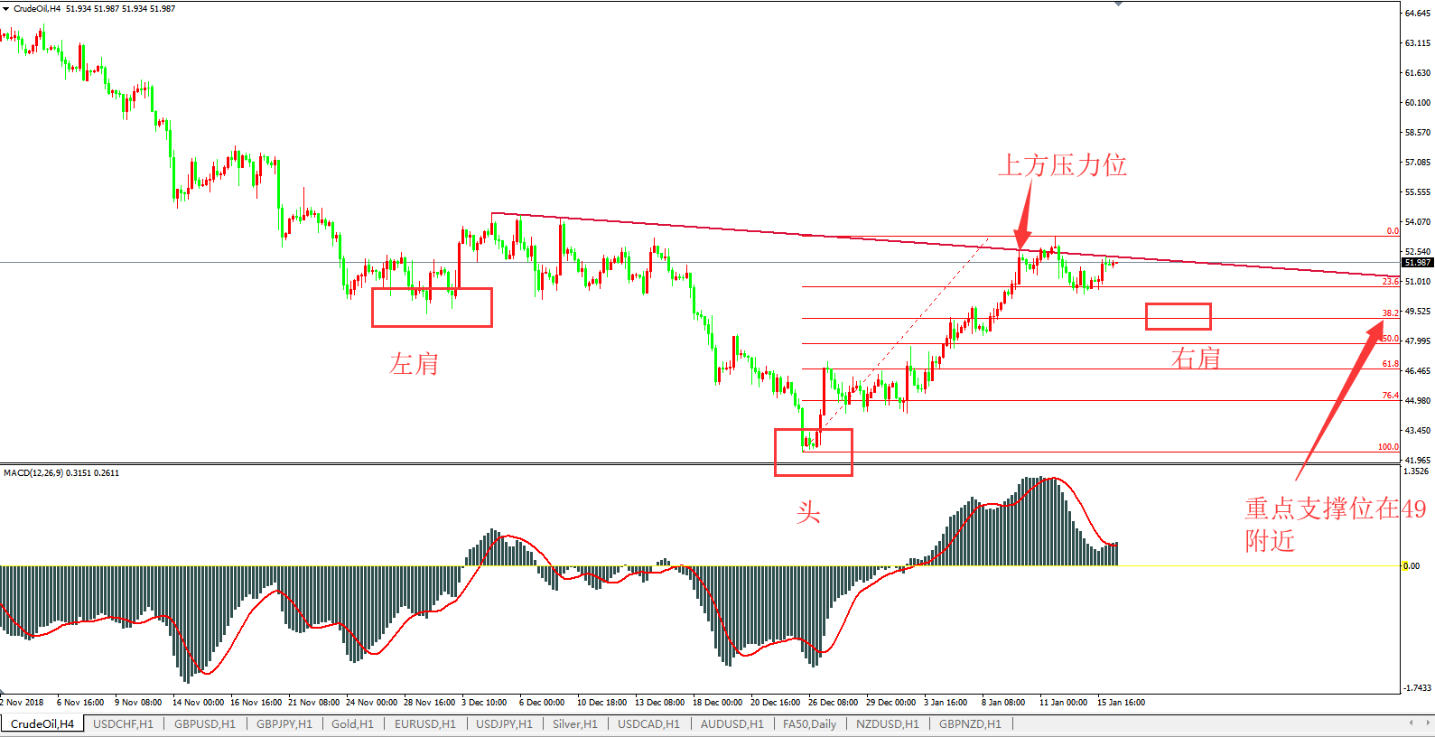 油价在大趋势方向上看涨思路不变,从空间上来看,日内短期下方的支撑在50附近,上方压力在52.3到52.5这个区间,从时间上来看这次油价的调整时间可能会更长,所以做多拿趋势还需要坚定信念。