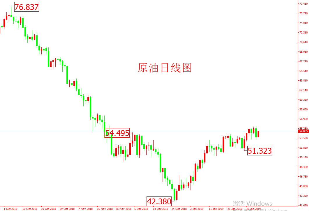 上周委内瑞拉宣布与美国断交,市场担忧原油供应短缺,油价受此支撑上涨,同时中美谈判利好油价,但是全球经济下行压力很大影响原油的需求。从数据上来看,上周六公布的美国钻井总数有所下降利多油价。技术上,55.5美元为76.8-42.3美元38.2%的位置,近两日短线在此受阻明显,若能向上突破则可以关注57.0和60美元的目标;若不能突破,则可能重新考验50美元的支撑位置。