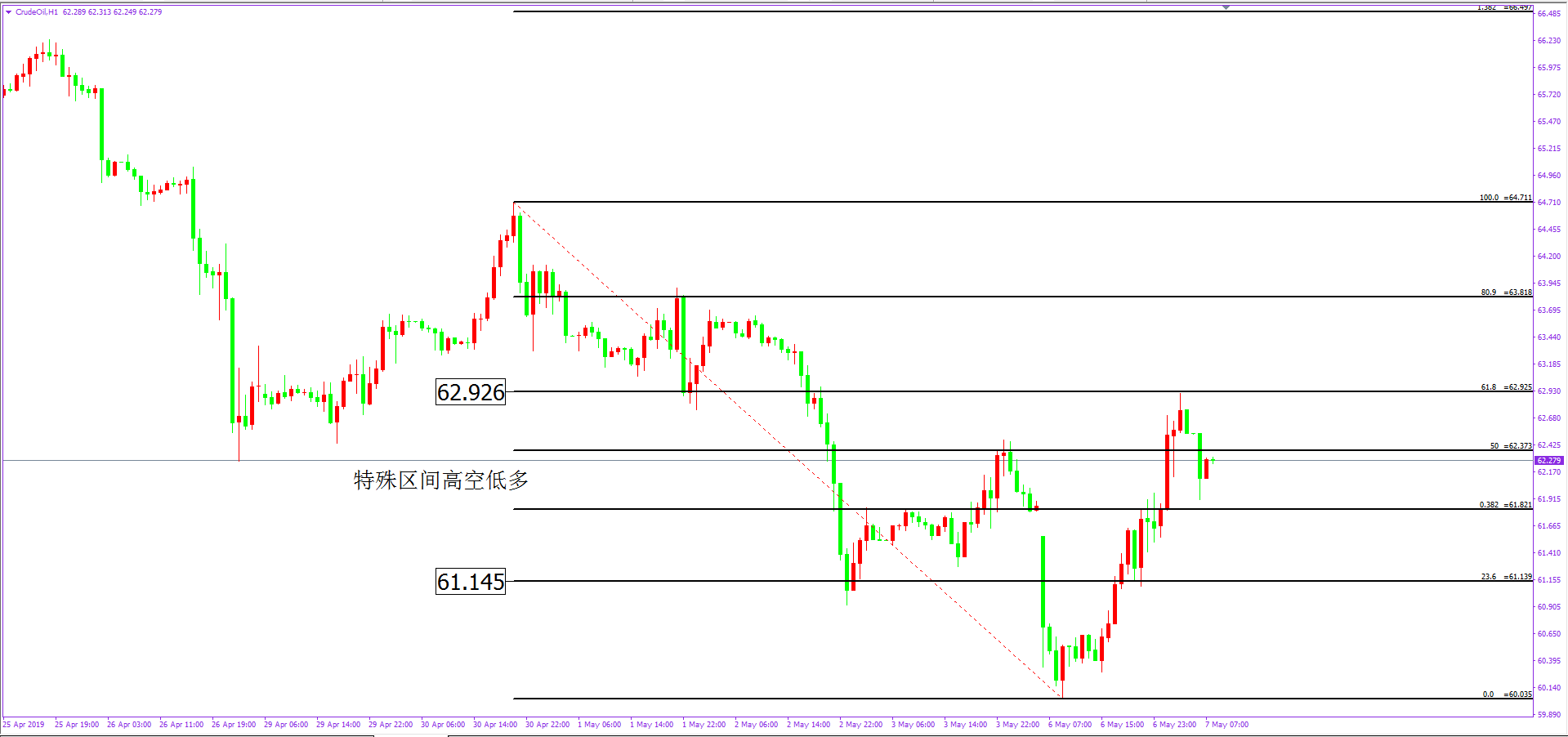 【原油】下行支持位61美元/桶附近, 上方阻力位63美元/桶一线。在原油小时级别走势中,因昨日贸易局势恶化导致原油跳空测试新低至60美元/桶附近,反而构建了下跌五浪诱空行情,因此在短周期可先考虑原油的特殊交易区间为63--61一线,而日内交易者则参考特殊区间考虑高空低多的策略为主。即上方63一线进场空单,止损63.5,止盈参考61附近。