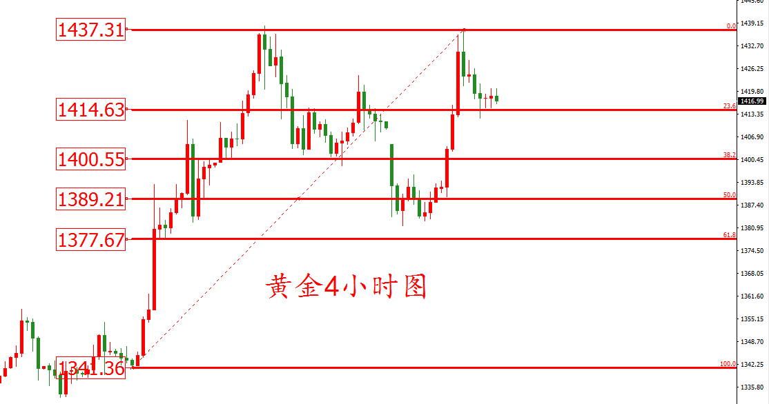 昨日避险情绪并未在黄金上延续,金价早间上冲至1437美元之后开始回调,晚间小非农ADP就业人数公布之前下挫至1415美元的位置,然后横盘震荡。从走势上来看,上方1438美元的位置短线阻力较强,金价有望继续回调。