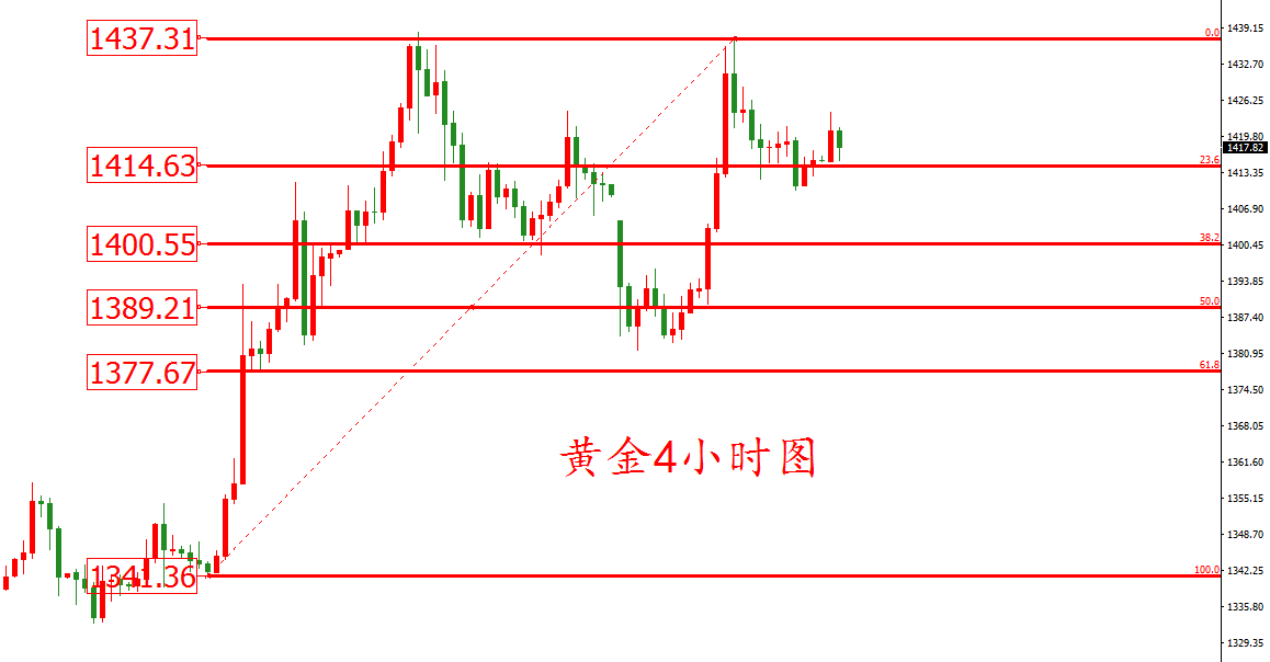 技术面,黄金昨日延续回调走势,在1414-1420美元区间震荡之后,晚间选择下破,最低触及1409美元的位置。今日开盘之后直接上涨,非农公布之前预计黄金短线会继续震荡上行。