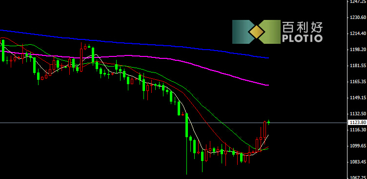 日线图上看,金价连续反弹,目前到了关键阻力带区域1120-1140,多空将争夺激烈加剧,金价整体下跌趋势没改变。上方压力:1170 1145 1130 下方支撑: 1115 1100 1093(注意做好风险控制,更多最新策略请关注百利好金业/原油/外汇百利好金融集团)