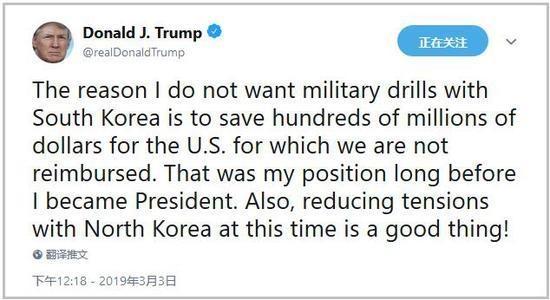 特朗普3月3日在社交媒体上发文称,自己不希望举行联演的目的是为了省钱。另外,特朗普还指出,在这个节骨眼上缓和与朝鲜的关系也不失是一件好事。