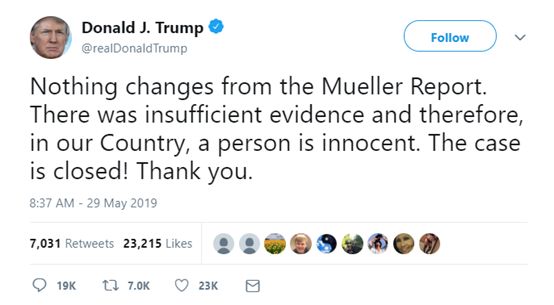 面对穆勒的发言,特朗普在推特上回应称:这与之前穆勒报告里的内容没有任何不同,没有足够的证据,所以在我们的国家我就是无辜的。案子已经结束了,谢谢你们。