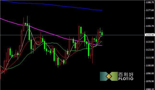 盘面看,金价受阻于1150,料将反复震荡。短期均线仍然支撑金价反弹,1130下方重要支撑,整体下行的大趋势未能改变。上方压力: 1170 1160 1150 下方支撑:1130 1110 1100。注意做好风险控制,更多最新策略请关注百利好金业/原油/外汇百利好金融集团
