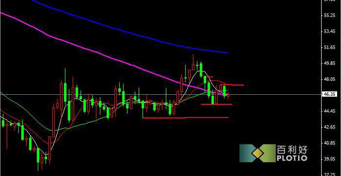 3、盘面上看,油价重回下轨通道运行,显弱势,短期保持震荡承压。油价反弹受10日均线的压制,47.50阻力较大,短期区间45.20-47.50。如果失守45.20,将测试43.20,反之测试48.20。注意做好风险控制,更多最新策略请关注百利好金业/原油/外汇百利好金融集团