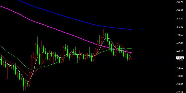 4、盘面来看,油价反弹幅度较小,多头无力,短期均线继续对油价施加压力,料油价震荡承压。上方阻力为45.2、46.2、47 下方支撑44、43.5、43。