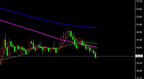 盘面来看,受5日均线压制明显,油价弱势持续,料将震荡寻底。上方阻力为43.5 44.2、45.2 下方支撑43、42、40。