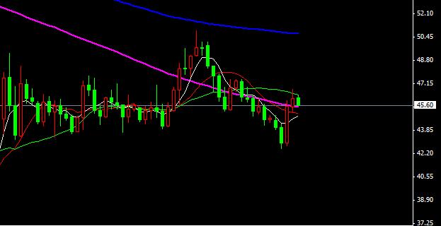盘面上看,油价连续两天反弹,但有趋缓的迹象。上方20日均线对油价反弹施加压力,如不能有效上破,料将继续震荡。45-47.5该区间成交密集,料阻力较强,下方支撑:45、44、42.5。