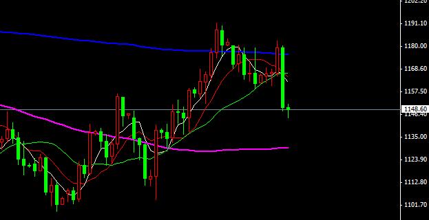 盘面上,金价重回下行通道,弱势持续,料震荡承压。但下跌过快,需注意反弹修复要求,短期阻力1150。上方压力:1180 1170 1162,下方支撑: 1137 1130 1110。