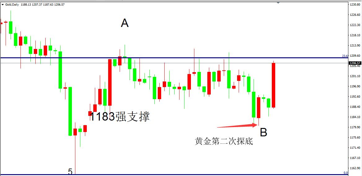 从黄金日线图来看,整体上仍处于1183到1210这个区间震荡,