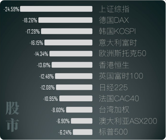 股市作为经济晴雨表在过去的2018年全球股市均大幅下跌,跌幅超过20%则视为技术性熊市。2018年全年,上证综指下跌24.59%,深证成指下跌34.42%,创业板指下跌28.65%,沪深核心指数全年跌幅都超过了16%。全部A股中超过九成股票下跌,涨跌幅中位数是-33.5%。A股总市值为43.36万亿元,全年缩水13.26万亿元。
