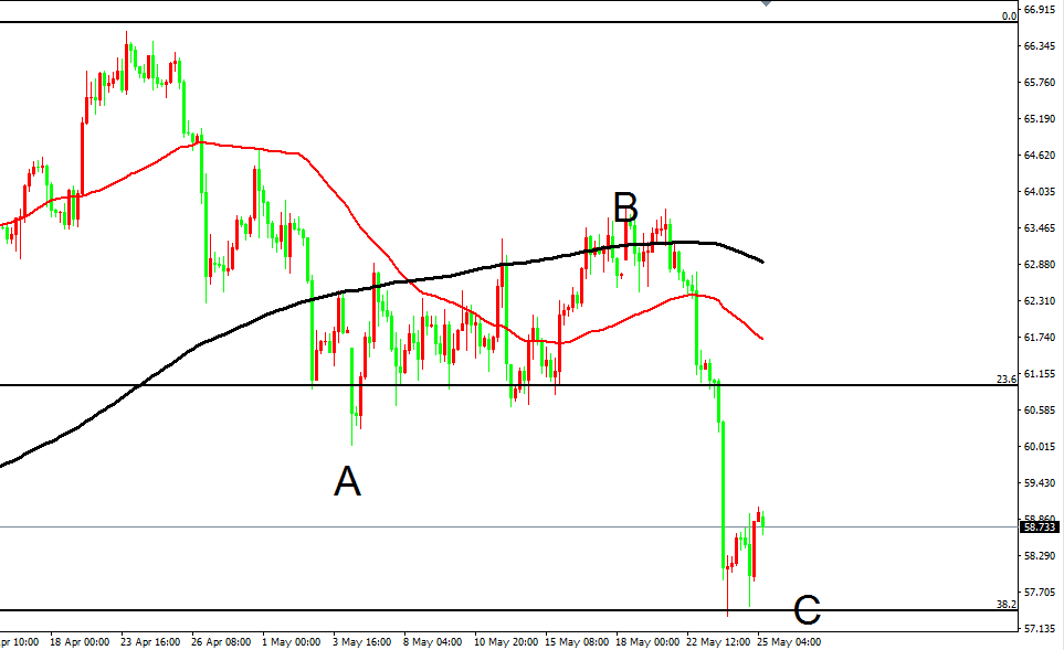 原油方面:上周原油表現整體較弱,造成這種局面的主要因素我們認為主要有以下幾點,第一貿易局勢升級,全球經濟表現不及預期打壓了全球對原油的需求,促使原油從高位大幅回落。第二,全球輕質原油市場繼續供大於求,OPEC減產遇阻。第三中東局勢有所緩解。本周一英國市場因春季銀行假日休市,美國市場因陣亡將士紀念日休市,這是夏季駕車旺季的開始。美國汽車協會(AAA)預計,美國陣亡將士紀念日周末的客流量將創下自2000年開始統計以來的第二高水平,汽油需求會有所增加,這有有望給油價大短線反彈提供機會。從技術面來看,4小時級別原油三浪下跌空間基本已經到位A浪與C浪基本呈現1:1的關系。時間上原油這輪下跌上周五有提示大家會跌到本周二,所以符合時空共振的標准,建議投資者關注下方57.4的支撐,日內考慮開始在後半夜做多原油。