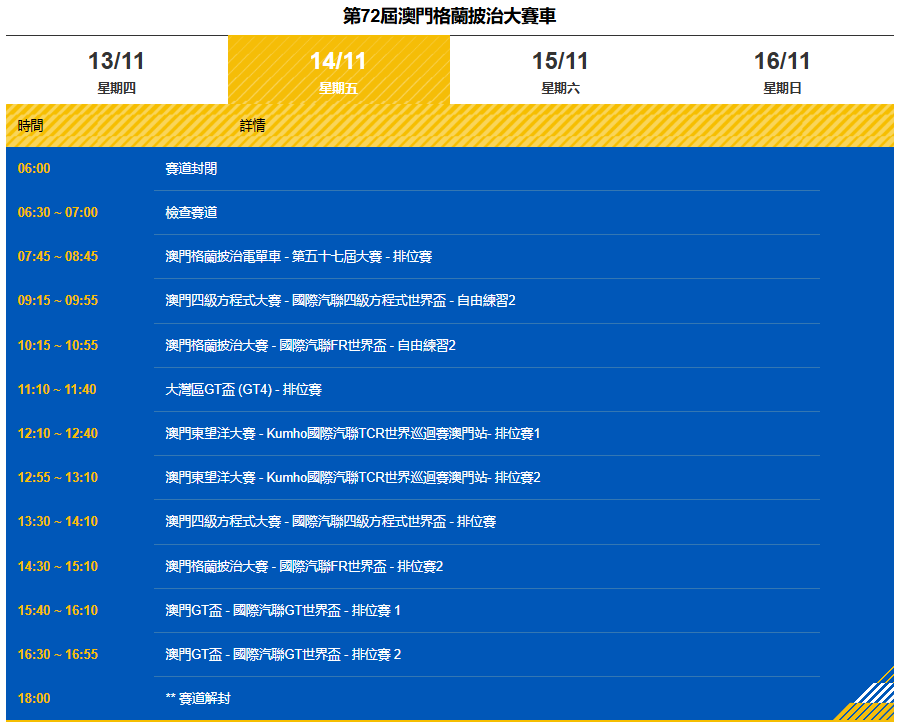 首日(13日),主要以各大賽事的自由練習賽為主,澳門格蘭披治電單車(摩托車)、國際汽聯四級方程式世界盃、國際汽聯FR世界盃(區域方程式)、TCR世界巡迴賽以及GT世界盃等核心賽事均完成了首次練習。