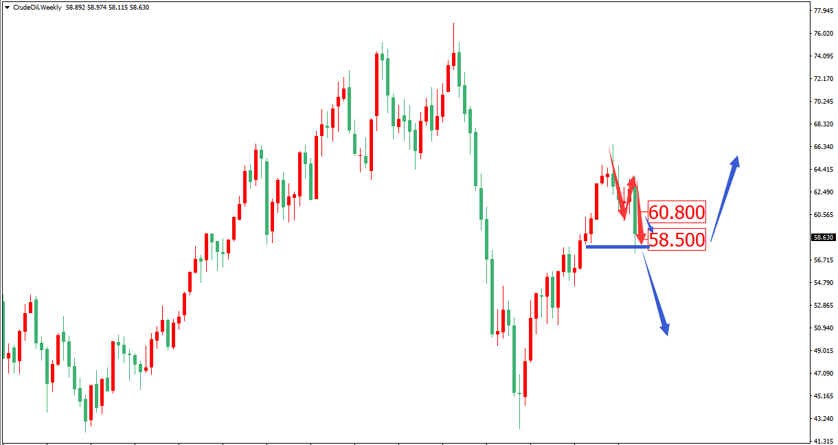 從技術面看,油價在至66美元下行以來,在上周已經完成日線級別AB=CD的下行結構,當前在配合周線級別20均線的支撐之下,本周我們將重點關注58.5附近的跌破。在此之前建議仍以低多思路進行看待,上方關注60.8之下的壓制情況,但若價格再次破位上周低點,行情將很有可能改變此前的多頭結構,進而打開更大的下行空間(55美元和51美元)。總之,關於油多是否長久,本周的朝暮之間都將可能牽動市場的神經。