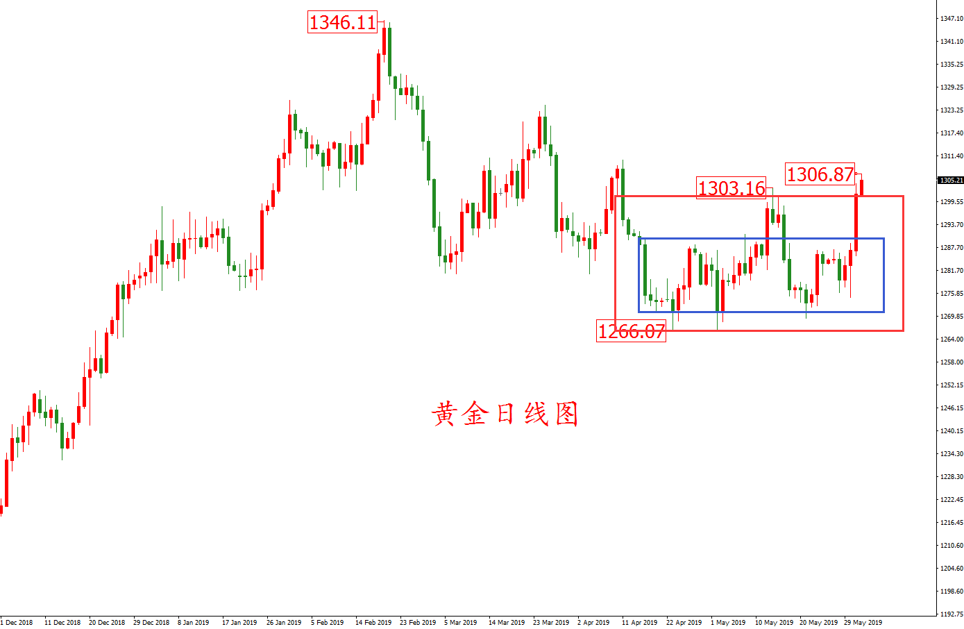 五月最後一周市場詭譎多變,避險情緒再次推升至新高度,歐洲央行下調下半年經濟預期,債市收益率紛紛創下新低,從而引發市場更為恐慌的情緒,美元也因後市的壓力短線出現大幅下挫。黃金應聲大漲,截至周五收盤,黃金最高觸及1306美元的位置,突破一個多月以來的震蕩走勢。