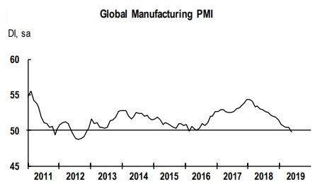 自去年開始全球經濟出現明顯下滑,部分國家幾乎臨近崩盤,日本央行超寬松多年無果,歐洲央行無奈之下考慮第三輪大寬松,全球經濟預期一再下調,截止目前全球制造業PMI指數已經跌至50之下。相對強勢的美國也同樣出現疲態,自去年十月以來美國GDP增速從4.2%下滑至2%,制造業PMI指數跌至50枯榮線附近,也預示著未來半年美國經濟增速還將持續下滑。