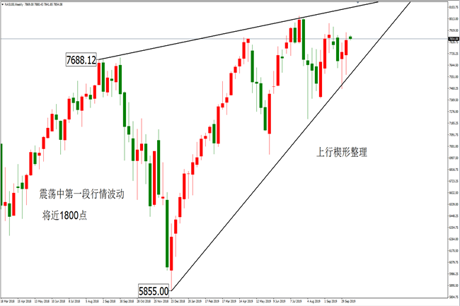 因三大股指走勢大致相同,暫且以納斯達克指數的分析為例。在2018年下半年之後,納斯達克指數開始陷入高位震蕩,並於現今構築有效的上行楔形,楔形之內第一段行情波動幅度1800點左右。而且目前,納斯達克指數已於楔形之內完成小五段的震蕩,即將存在破位的概率,若該指數在近期能借助基本面事件出現利多上破,則後續可看漲的空間利潤依舊將近1100--1800點左右(震蕩行情的趨勢理念核算方式,破位後的空間和震蕩第一段行情1:1或者1:0.618),即上方9200--9900附近;而若基本面呈現利空,指數下破下方支撐,則後續空間亦同理將近1100--1800的下跌空間,即可看下方5800--6500。故在目前短期內來看,美國三大股指雖然波動空間受限,但其破位之後的行情卻能讓我們缽滿盆滿。