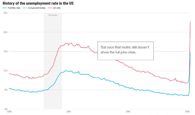 第一方面,由於疫情的影響,很多人雖然現在有工作,但是無法去上班,也無法領取薪資。第二方面,由於整體經濟環境不好,很多人暫時放棄尋找工作,包括失去工作之後選擇提前退休或者重新就學。第三方面,短時雇傭和臨時工失業沒有計入整體的失業率,而這個群體卻是在經濟衰退期間影響最為嚴重的。