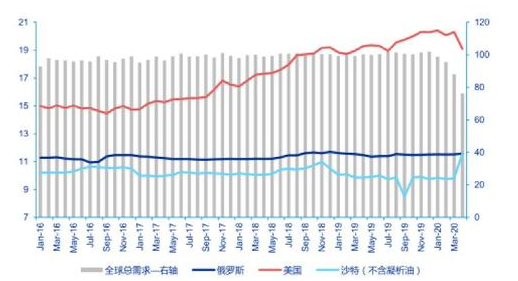 图示:美、俄、沙原油产量及全球原油需求