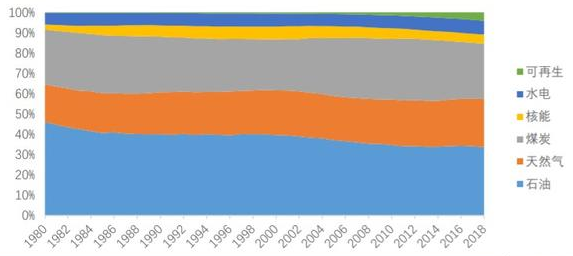 由于全球环境压力日益增大,清洁能源的使用不仅受到全球各国政府政策的推动,也受到主体市场的青睐。根据全球一次性消费能源结构来看,天然气的地位在不断上升,由 1980 年的 18%逐步提升至 2018 年 的 24%,而石油则从 46%下降至 34%,煤炭稳定保持在 27%,未来天然气有望赶超石油和煤炭成为第一大能源。