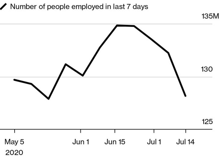 受疫情影响,美国截止7月18日当周初期失业金人数达141.6万人,这一数字自三月以来总体仍维持100万之上;从续请失业金人数来看,虽连续6周下滑,但仍然超过1600万人。另外,美国人口普查局周三(7月22日)公布的家庭脉搏调查(Household Pulse Survey)显示:5月中旬到6月中旬就业增加了550万,与劳工部就业报告基本吻合,但从6月中旬至7月中旬,美国的就业人数下降了约670万,其中从7月第一周到第二周就下降了410万。随着疫情继续蔓延,美国的就业人口出现大幅回落,这或使得8月公布的非农就业数据表现较差。