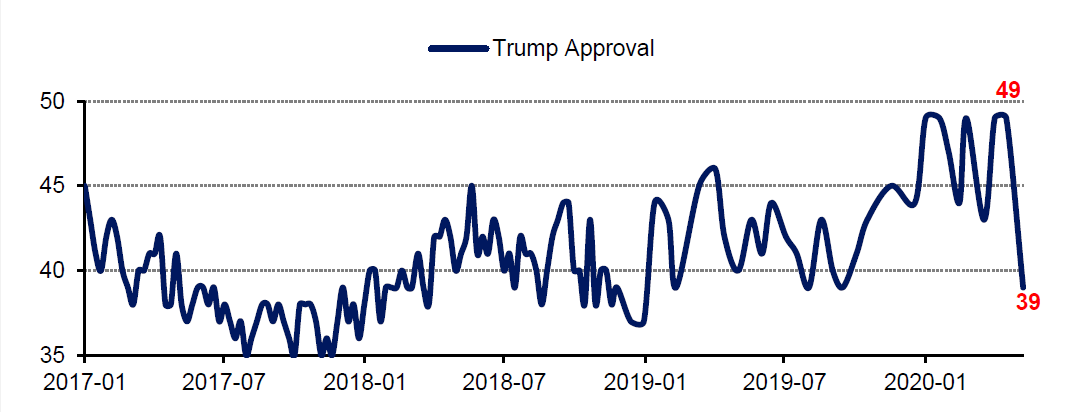 开篇谈到特朗普在非农数据公布之前就已经提前剧透,让笔者印象深刻的是特朗普好像不是第一次这么干。笔者认为当下特朗普即将面临中期大选,而疫情和抗议游行将特朗普前四年结的果全部打碎,根据最新民调显示,特朗普已经落后拜登将近9个百分点,支持率已经低于40%。而根据历史统计规律,只要在第一任期内大选年支持率不低于40%,连任应该是大概率事件。
