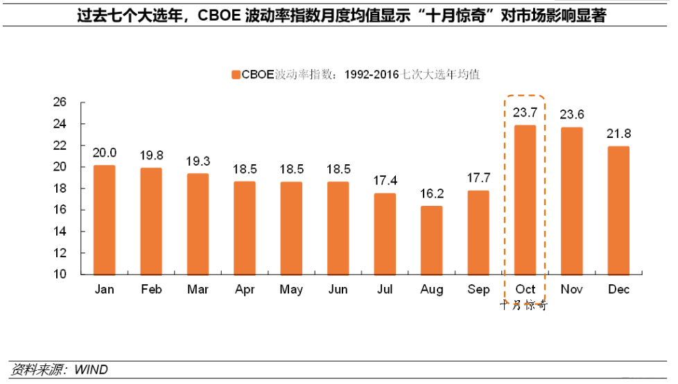 从统计来看,1992-2016年7个大选年的数据显示,CBOE波动率指数月度均值出现显著的“十月效应”,即十月市场的波动率明显高于其他月份。表明在大选期间市场的关注度极高,从而导致了市场较大的波动,这需要我们格外关注。