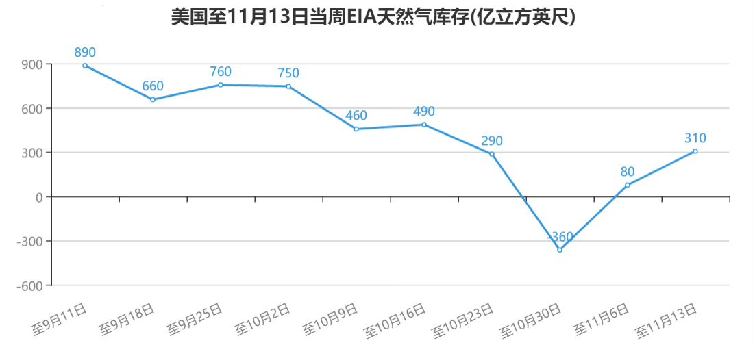 据美国至11月13日当周EIA天然气库存数据显示,美国天然气库存在本统计周期大幅增加310亿立方英尺,连续三周录得库存增加,这也和天然气价格从10月30日急转直下相吻合。除了10月30日的天然气库存减少意外,今年三季度的天然气库存一直呈增加状态,高企的库存是天然气价格上行的严重隐患,在库存和需求走向平衡之前,天然气价格难有好的表现。