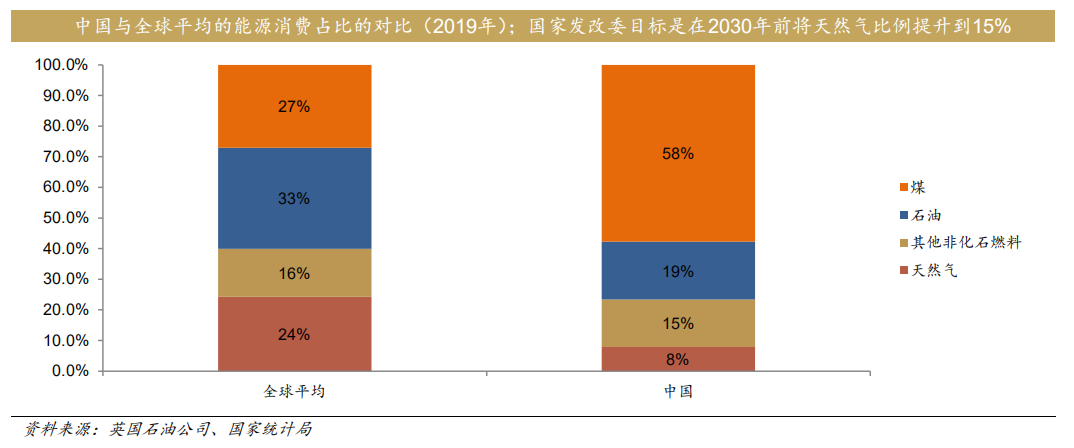 以中国为例。中国政府的目标是在2060年实现碳中和,作为低碳排放的天然气将在以煤炭能源为主向可再生能源为主的过渡中发挥重大作用。目前我国天然气发电只占全国总发电装机容量的5%左右,相信随着更多政策的支持以及先进技术的运用,天然气需求将会有质的飞跃。如下图: