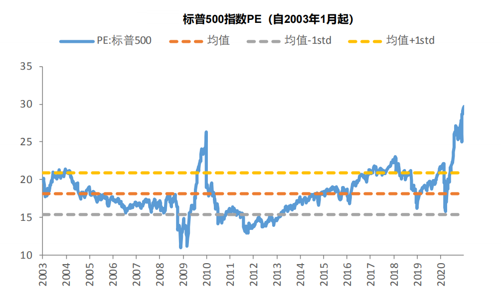 根据美国三大股指估值情况来看(标普500为例),标普500指数历史市盈利率PE持续上扬至29.72,触及2003年以来的最高水平。根据价值规律,商品的价格由价值所决定,价格围绕价值上下波动。而目前标普500指数估值刷新2003年以来的最高水平,警惕其回归价值,下行回调风险。